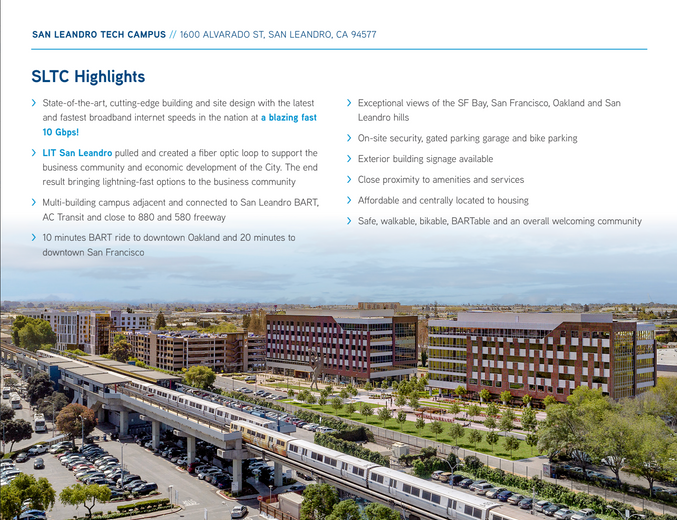 Westlake Urban’s San Leandro Tech Campus (SLTC) is an in progress 1 million-square-foot, technology-focused mixed-use development project located adjacent to the Downtown San Leandro BART Station. SLTC was built in partnership with local tech leaders and experienced urban planners. It is central to San Leandro’s transformation and connected to the 21st century innovative tech-oriented ecosystem. The high-speed fiber optic service to the project serves each building with the high-speed fiber and together with the electrical service supplied to the project, it makes SLTC a great match for today’s, as well as tomorrow’s technology focused and Artificial Intelligence (AI) companies.